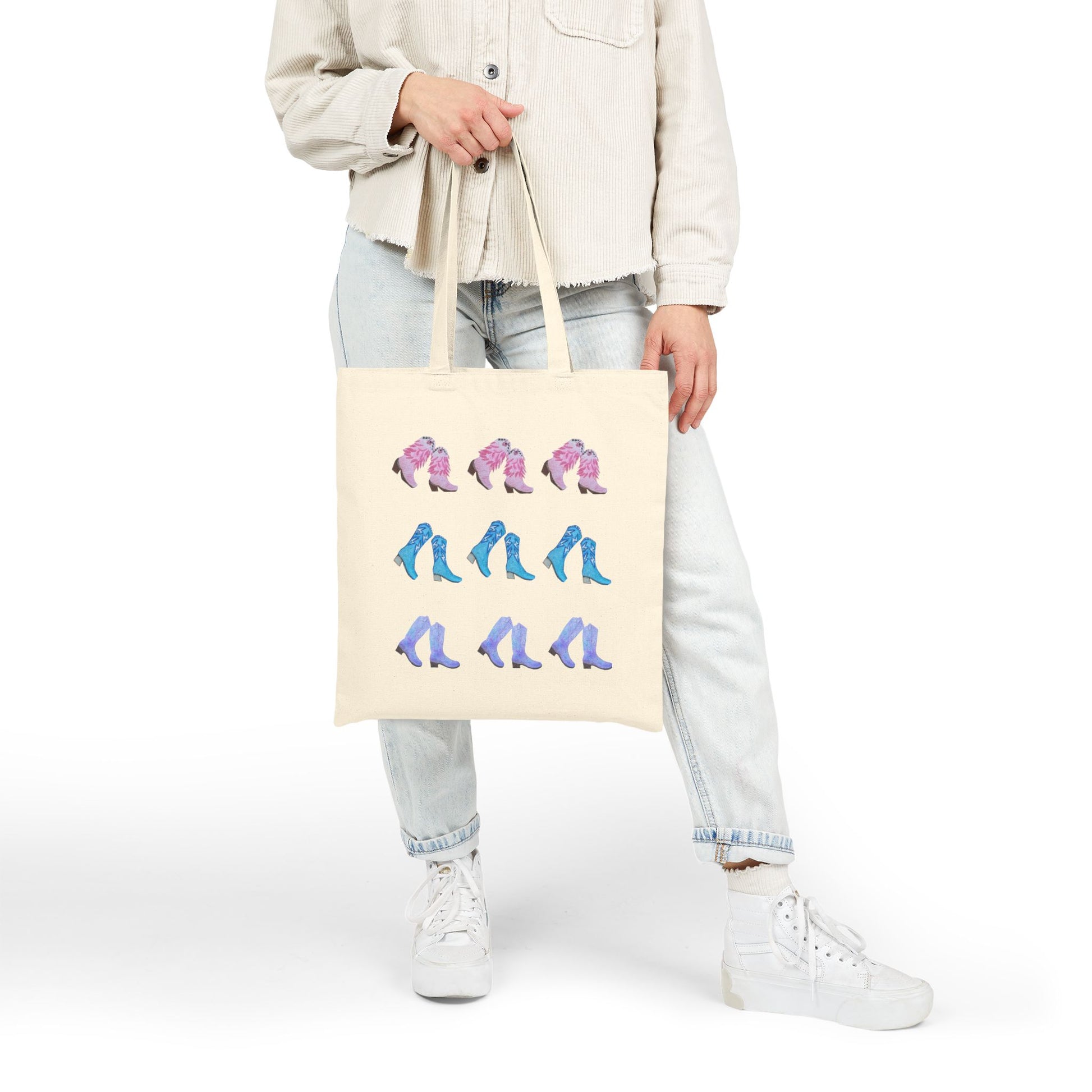 Featuring original watercolor art of pink, blue, and purple boots, this tote triples down with a repeating pattern — for cowgirls who know one bad decision is never the whole story.